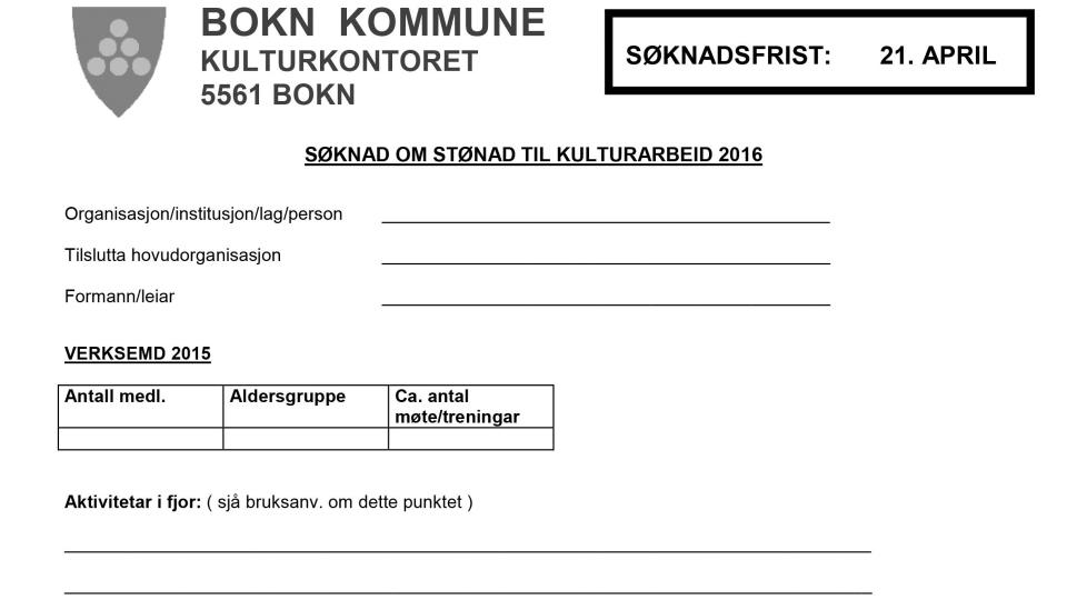 Kulturmidlar 2016 Søknad om tilskot til kulturarbeid skal likevel ikkje sendast elektronisk. Publisert 31.03.2016 kl. 14.20