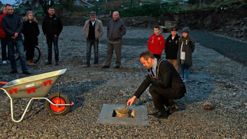 Grunnsteinsnedlegging på fleirbrukshalltomta 21. oktober blei oppstart av arbeidet på fleirbrukshallen markert med grunnsteinsnedlegging på tomta i Føresvik. Publisert 27.10.2015 kl. 15.36