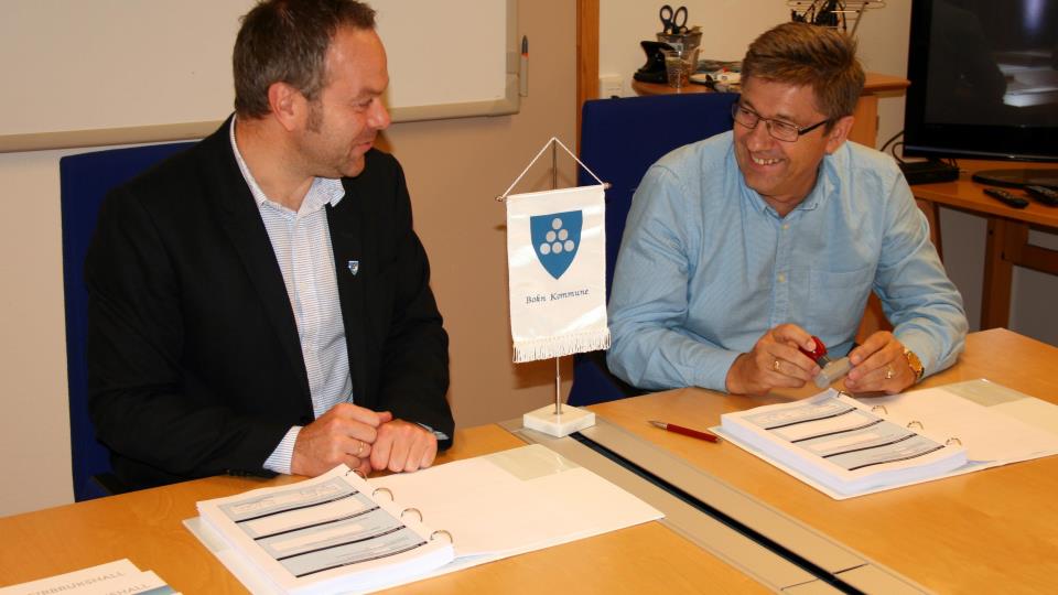 Kontrakten underskriven I dag, 29. september blei det skrive kontrakt på Bokn fleirbrukshall mellom Haaland & Thuestad og Bokn kommune. Måndag 5. oktober er det oppstart. Bil... Publisert 29.09.2015 kl. 14.59