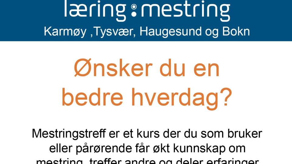 Meistringstreff Kurset går over seks samlingar med oppstart 15. januar 2019 kl.11.00. Påmeldingsfrist er 17. desember. Publisert 15.11.2018 kl. 09.56