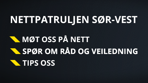 Nettpatruljen Sør-Vest Nå kan du kommunisera direkte med dedikerte politifolk på Messenger. Mange vegrar seg for å ringa politiet og tenesta skal gjera det enklare for folk ... Publisert 06.11.2018 kl. 14.09