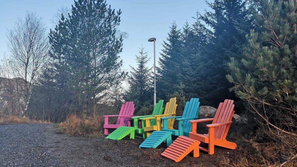 Til å bli i godt humør av! Den nyleg opplyste turstien i Føresvik har fått ein ny og fargerik «lyskjelde» - stolar frå Tio på Vea. Publisert 29.10.2018 kl. 17.16