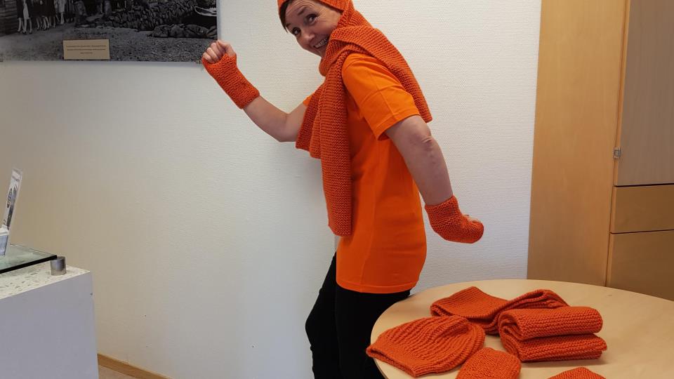 Oransje haust! Rundt 150 oransje garnnøster er ute på bygda i samband med oransjeskjerf-aksjonen.Bilde: Mannekeng Gro Sørensen konstaterer prima kvalitet på skjerf, ... Publisert 14.09.2018 kl. 15.50