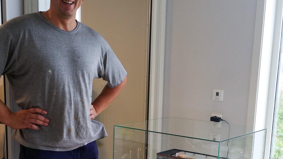 Særdeles flott! 27. august blei ein praktfull modell av Bokn Arena avduka i 2. etg. i fleirbrukshallen.Bilde: Modellbyggar Dominik Slodkowski stod sjølv for avdukinga... Publisert 29.08.2018 kl. 10.41