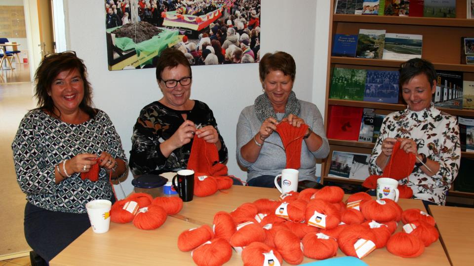 Går så det susar! Fleire og fleire vil vera med på årets strikkedugnad.Bilde: Strikkar for eit varmare samfunn med eit varmt smil, fv. Åse Helen Alvestad, Norunn Jordbr... Publisert 03.09.2018 kl. 15.11