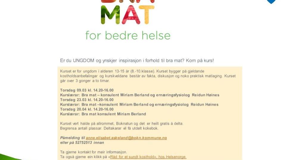 BRA MAT-kurs for ungdom Er du mellom 13-15 år? Bli med på Bra mat kurs! Publisert 09.02.2017 kl. 10.11