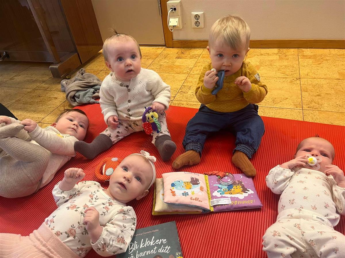 Den fine gjengen som blei fødd i 2024 (5 av 7) Sittande fv.: Hedvig Våga, Mia Skeie Johannessen Liggande fv.: Joar Jøsang, Amanda Tjøstheim Trosnavåg og Josefine Øvrebø. Saga Bendiksen Fossberg sov godt i vogna si under treffet (søvn er viktigare enn bildetaking😉). Tellef Voll Kolnes var ikkje til stades då bildet blei tatt.