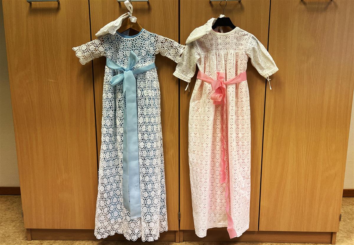 Den eine kjolen er hekla på dugnad av kyrkjeforeninga for ca. 55 år sidan. Første born som vart døypt i denne var Line Johanne Øvrebø i 1970.