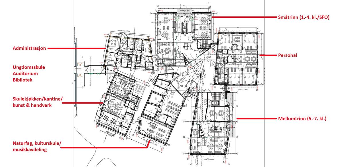 Forbi trapperommet og ut i fellesarealet fekk me personalavdelinga på høgre side, fløyen til småtrinnet (1.-4. kl.)/SFO rett fram og kulturskuleavdelinga på venstre side. Bak denne kjem naturfagrommet. I småtrinn-fløyen er det også ei rømningstrapp frå austsida av tilfluktsrommet, med dør ut til det fri.