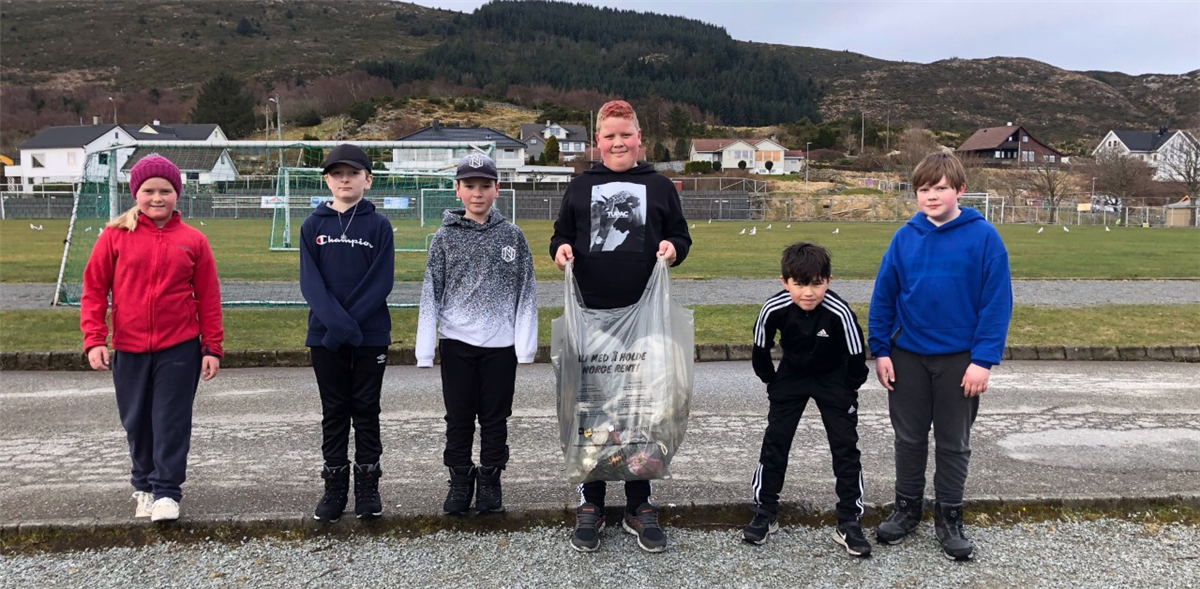 4./5. klasse plukka søppel rundt skulen, barnehagen og opp Kyrkjebakken. Her ser du Nora, Tobias, Kaspian, Eskil, Aksel og Sondre.