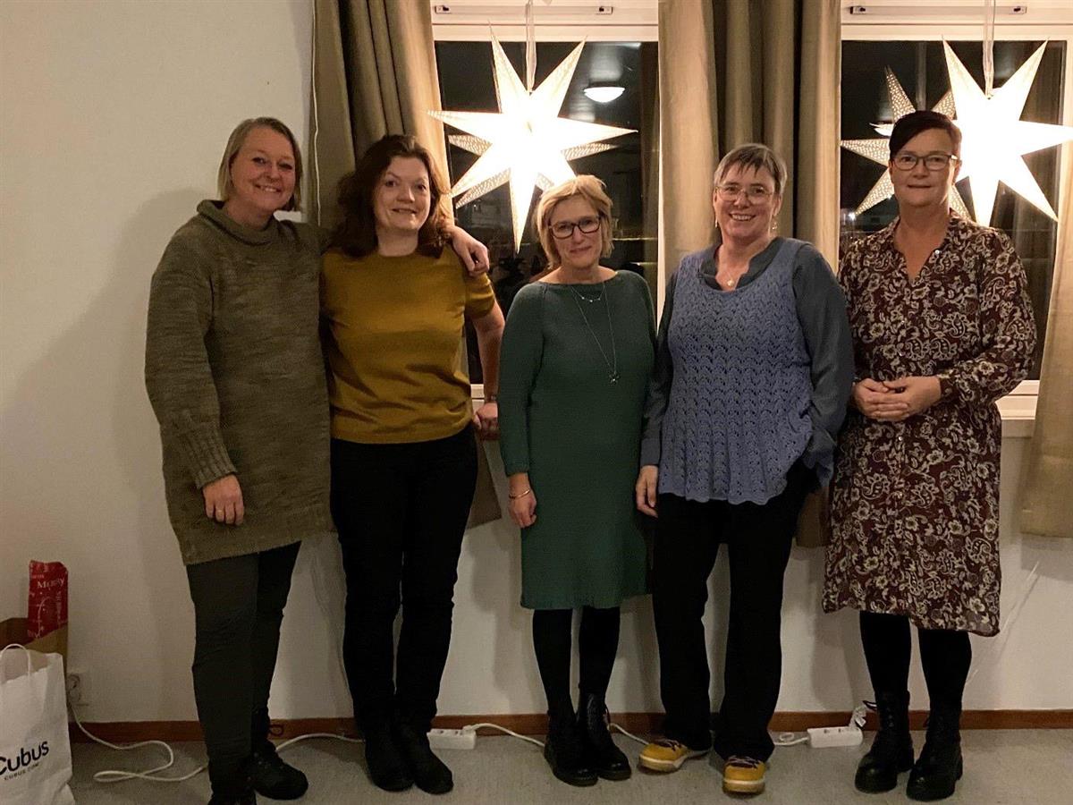 Denne flotte gjengen sørga for at lokalet vart pynta, at det vart servert både mat og drikke til alle frammøtte, og at julenissen var på plass. Frå venstre: Elisabet Taraldlien, Julianne Nilssen, Torny Rossabø, Ragnhild Trosnavåg og Annette Bokneberg.