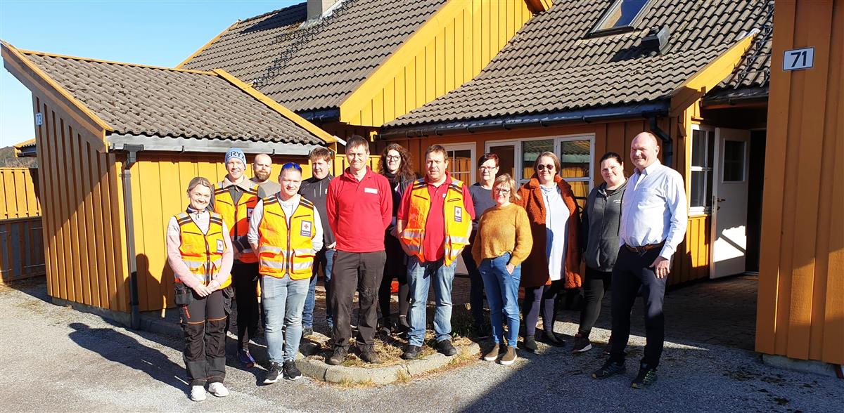 Flott gjeng framfor ein av leilegheitene, fv. Linn Kro, Kim Erik Larsen, John Øvrebø, Lars Øyvind Alvestad (alle frå Bokn Røde Kors), Ingleif Kro (frivillig), Kjell Frode Lie (Bokn Røde Kors), May Lisbeth Bosvik Fiskaaen (Bokn kommune), Kaj Arne Christiansen (Bokn Røde Kors), Annette Bokneberg, Torny Rossebø (begge frå Bokn hjelper Ukraina), Christine Christiansen, Susanne Øvrebø (begge frå Bokn sanitetsforening), ordførar Osmund Våga. Representantar frå Bokn idrettslag var ikkje til stades då bildet blei tatt.