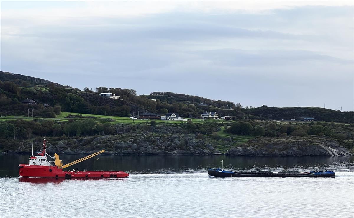 Eit kjent syn; transport av stein i Boknasundet, 23.09.23.