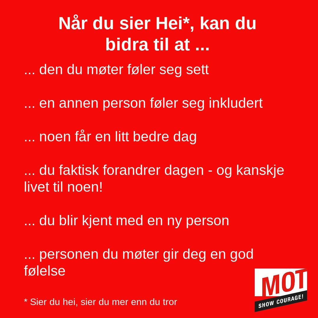 Derfor har MOT Norge valt å ha ekstra fokus på dette med å seia hei, inspirert av ungdommar som har fortalt at eit hei frå ein klassekamerat kan utgjera forskjellen på om ein føler seg sett eller ikkje.