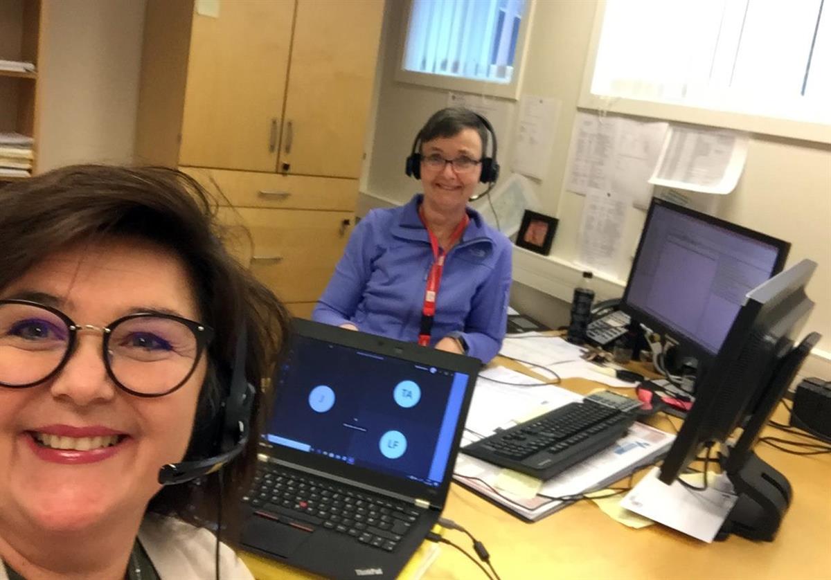 Sekretariat i Servicetorget; Åse Helen Alvestad med Gro Sørensen bak.