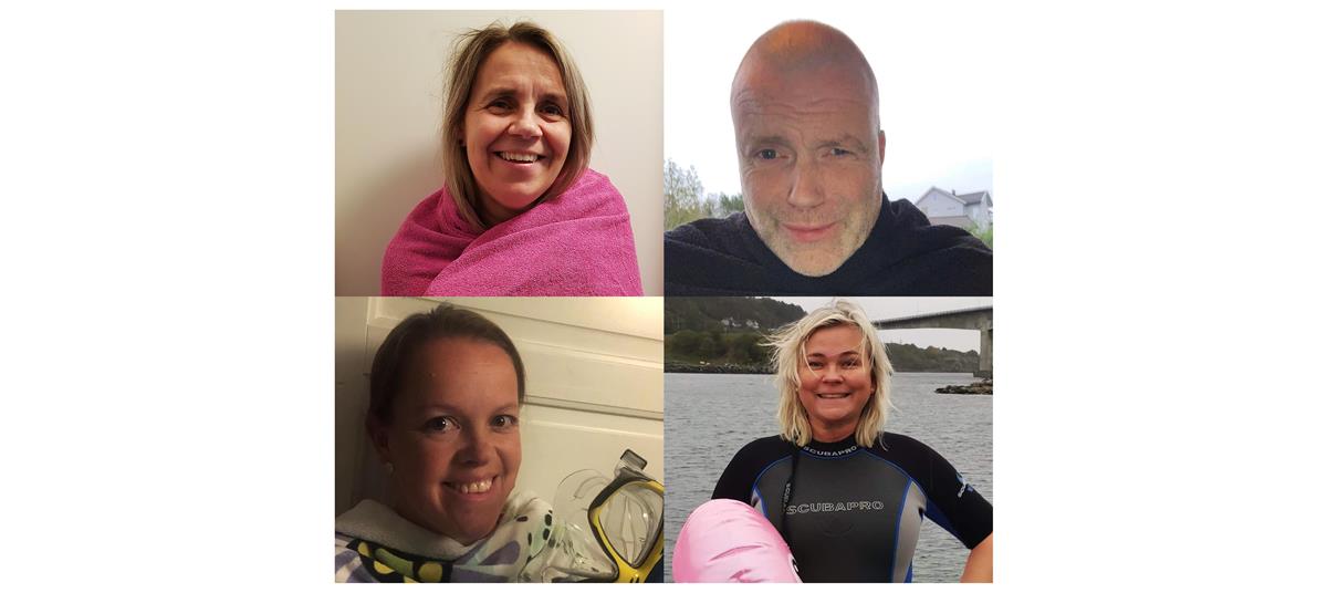 Rektor Wenche Havikbotn, inspektør Frode Lindanger og trinnleiarane Bianca Alvestad og Merete Alvestad ved Bokn skule hoppar i havet i morgon, tysdag 20. oktober.
