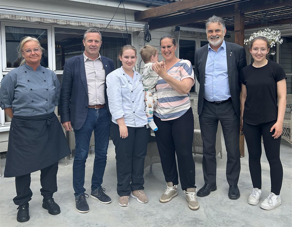 Til venstre kokk Anita Kro, ordførar Egil Våge, Sofie Øvrebø, Catharina Øvrebø med vesle Simon, fylkesvaraordførar Svein Erik Indbjo og Line Øvrebø.