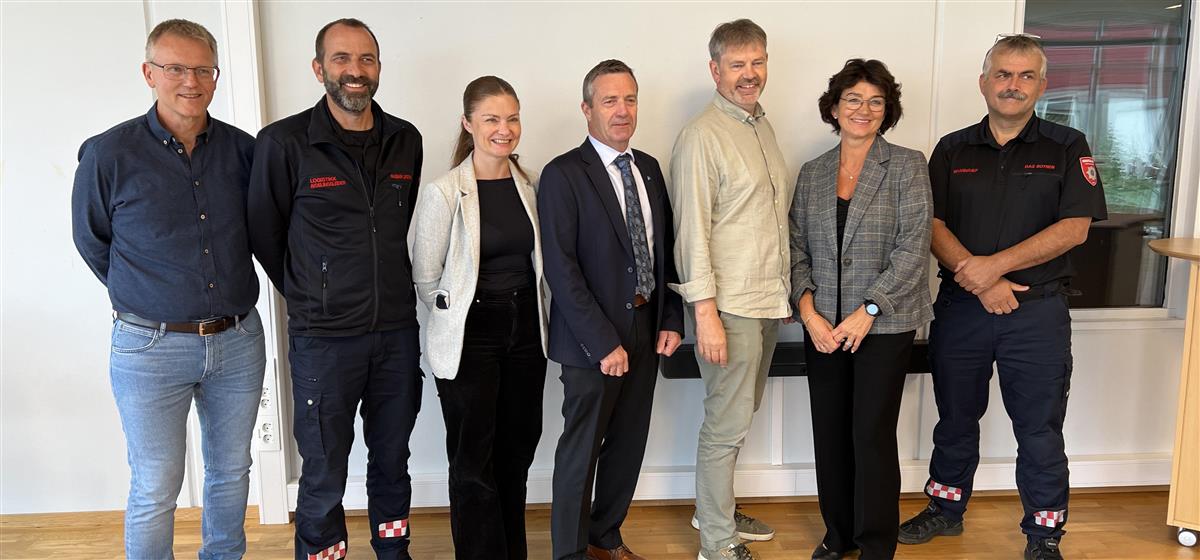 Tv. rådgjevar teknisk og miljø, Geir Øvernes, logistikk- og avdelingsleiar i HBR, Ragnar Løfstrøm, kommunedirektør Ingeborg Skjølingstad, ordførar Egil Våge, dagleg leiar i GL Prosjektservice, Geir Egil Høvring, leiar sal og marknad i GL, Elin Tryti og brannsjef Dag Botnen.
