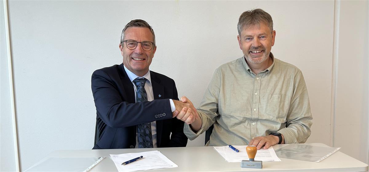 Ordførar Egil Våge (tv.) og dagleg leiar i GL Prosjektservice, Geir Egil Høvring har nettopp signert kontrakten.