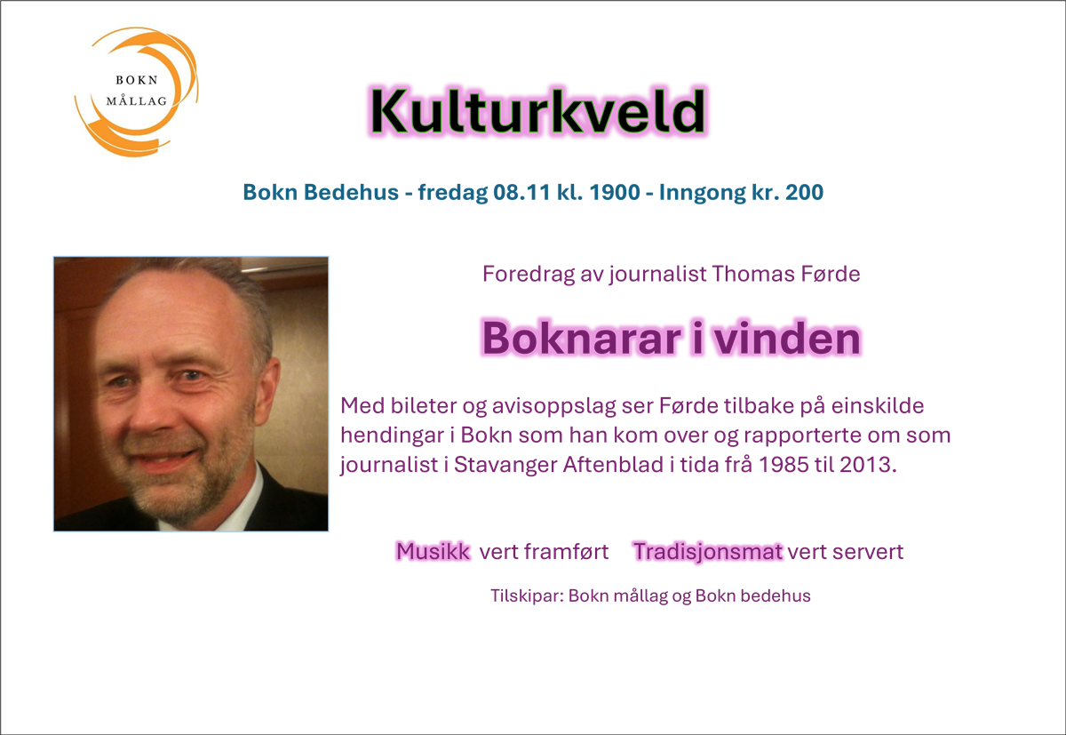 KulturkveldBokn mållag og Bokn bedehus ynskjer velkomen til kulturkveld i Bokn bedehus, 8. nov. kl. 19 Publisert av Jardar Havikbotn Publisert 01.11.2024 11.23