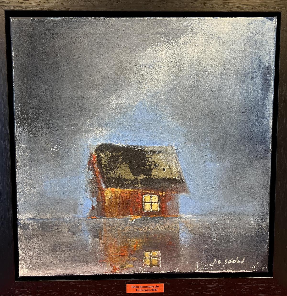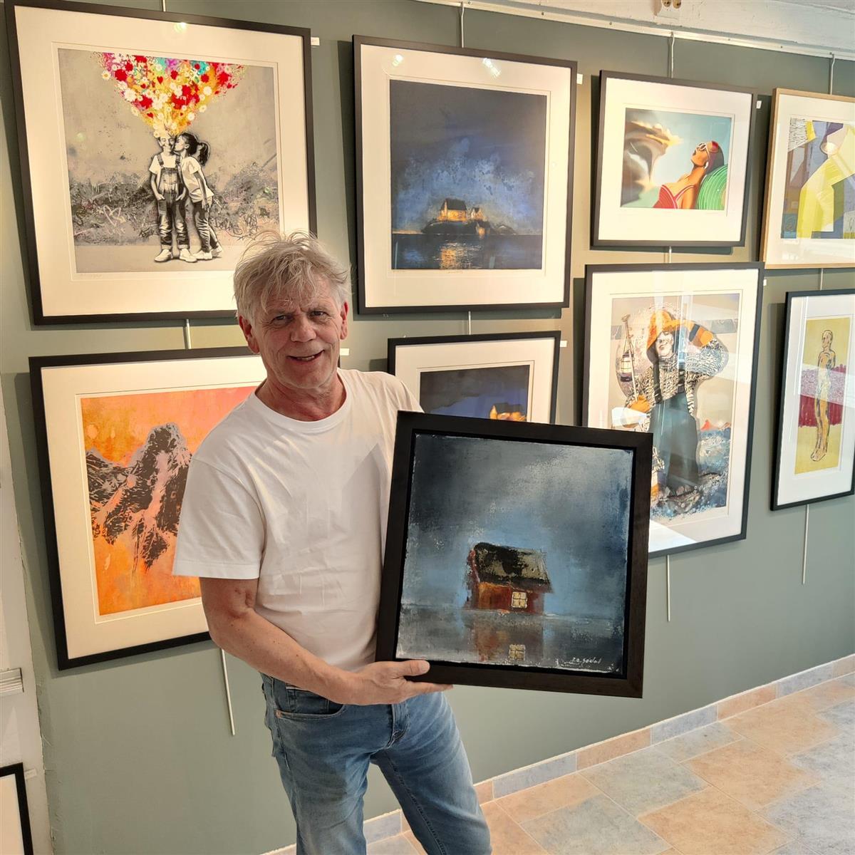 Kunstnar Per Ove Sødal var 2. mai innom Galleri Hantho i Haugesund med bildet som blei Bokn kommune sin kulturpris 2023.
