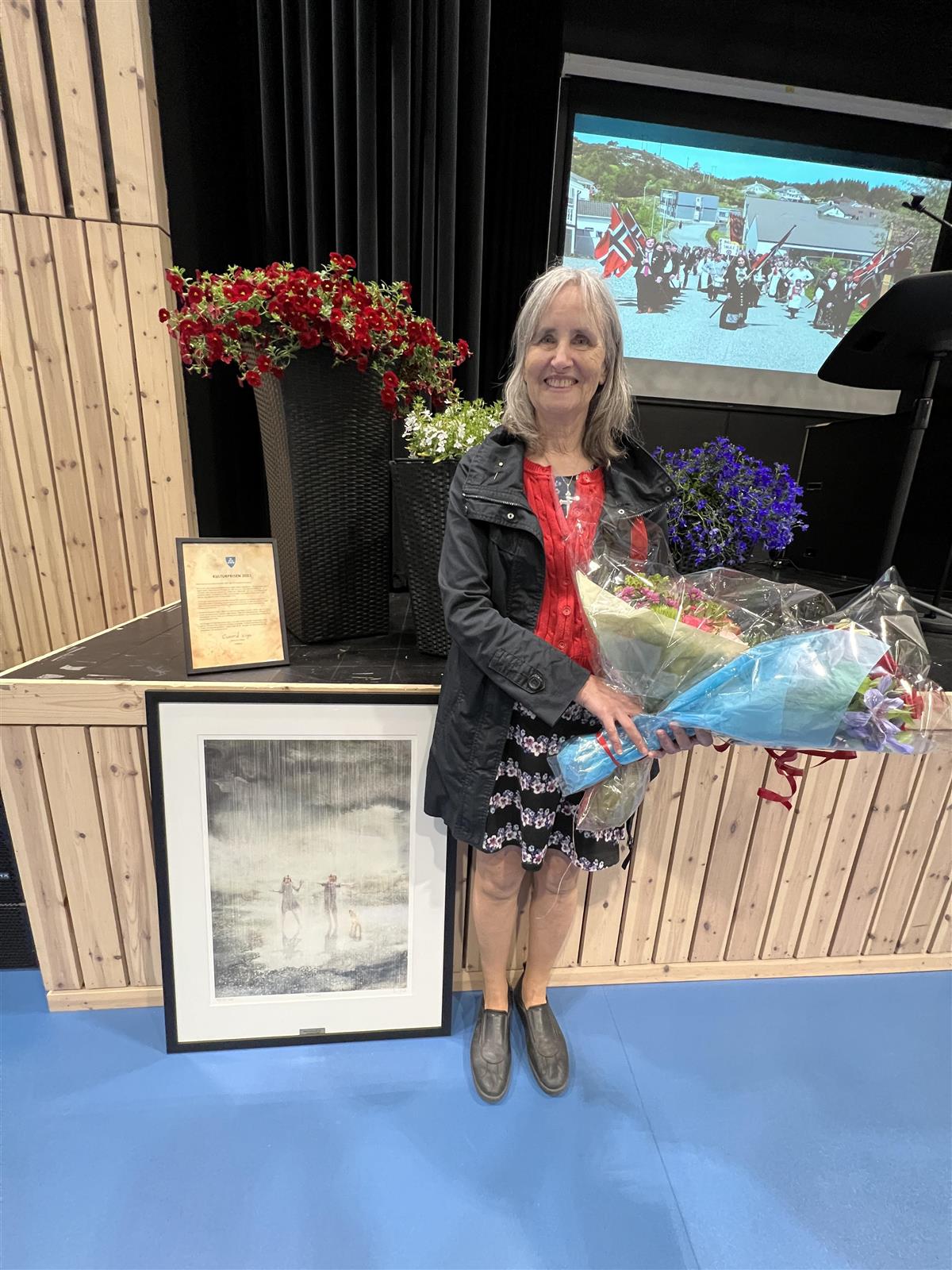 heiter “Regndans” og viser glade ungar som dansar ute. Kunstverket kan assosierast med prisvinnaren. I tillegg fekk ho blomar og diplom av ordføraren.