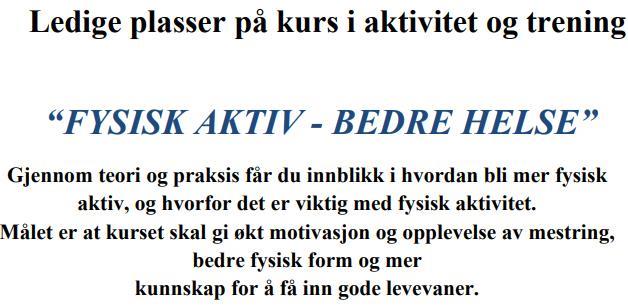 Kurs i aktivitet og treningBilde frå kursplakat. Jardar Havikbotn Ønsker du å endra levevanar innan fysisk aktivitet og trening? Då er desse kursa noko for deg. Interesserte kan ta kontakt med Miriam Berland, tlf. 404 10 570. Epost: friskliv@bokn.kommune.no Haugesund er kursvert, men Bokn kan melda på deltakarar: Få meir informasjon her (PDF, 193 kB) Publisert av Jardar Havikbotn Publisert 24.02.2022 09.28