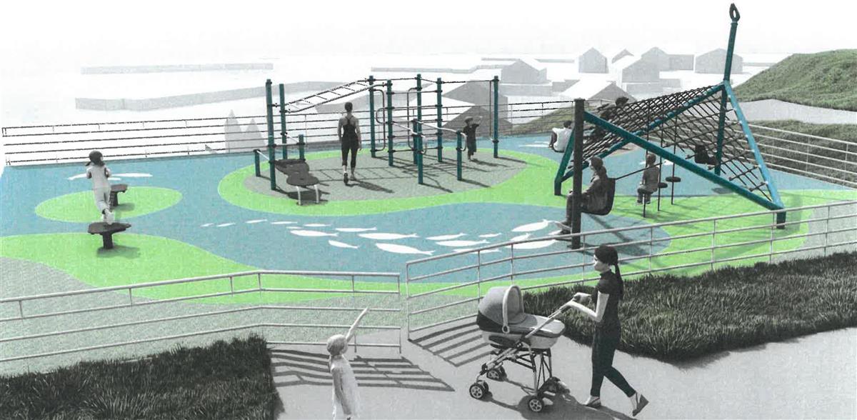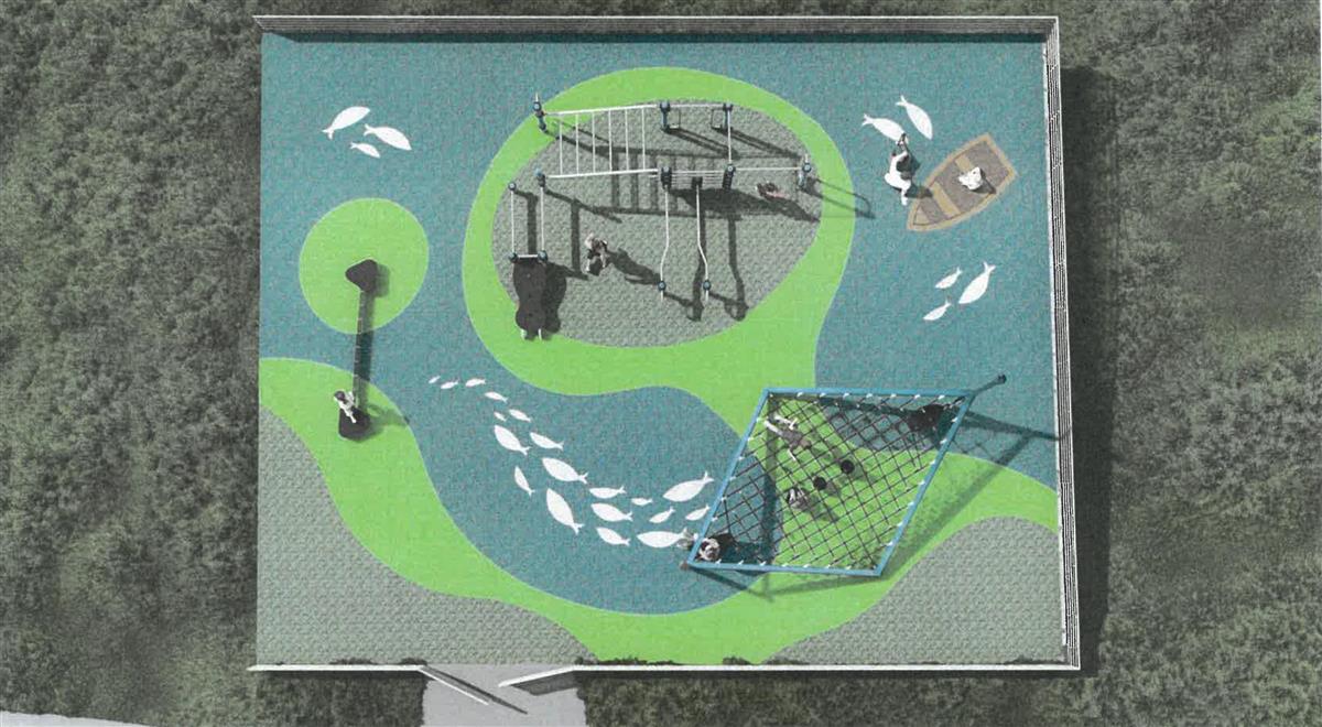 Anlegget sett frå lufta.Parken vil vera for alle aldersgrupper og inneheld klatreapparat, slackline for balansering og treningsapparat. Sjølve aktivitetsområdet skal ha gummidekke med mønster tilpassa Bokn.