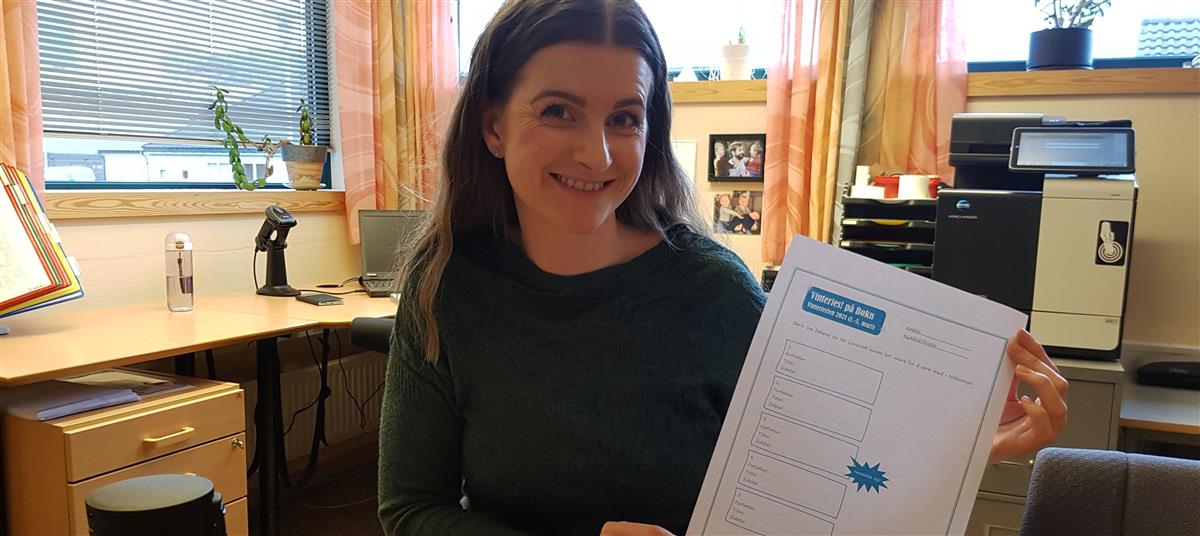 Biblioteksjef Thea Elisabeth Mikkelsen lovar kjekke premiar, der hovudpremiane er gåvekort frå Norli Hillesland. For å vera med i trekninga må skjemaet leverast på biblioteket innan 10. mars.