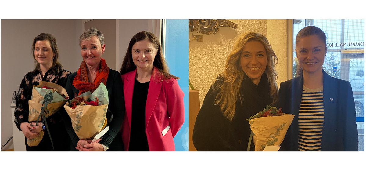 Venstre foto, fv.: Åshild Apeland, Gro Sørensen og kommunedirektør Ingeborg Skjølingstad. Høgre foto, fv. Anne Tove Øvrebø og Ingeborg Skjølingstad.