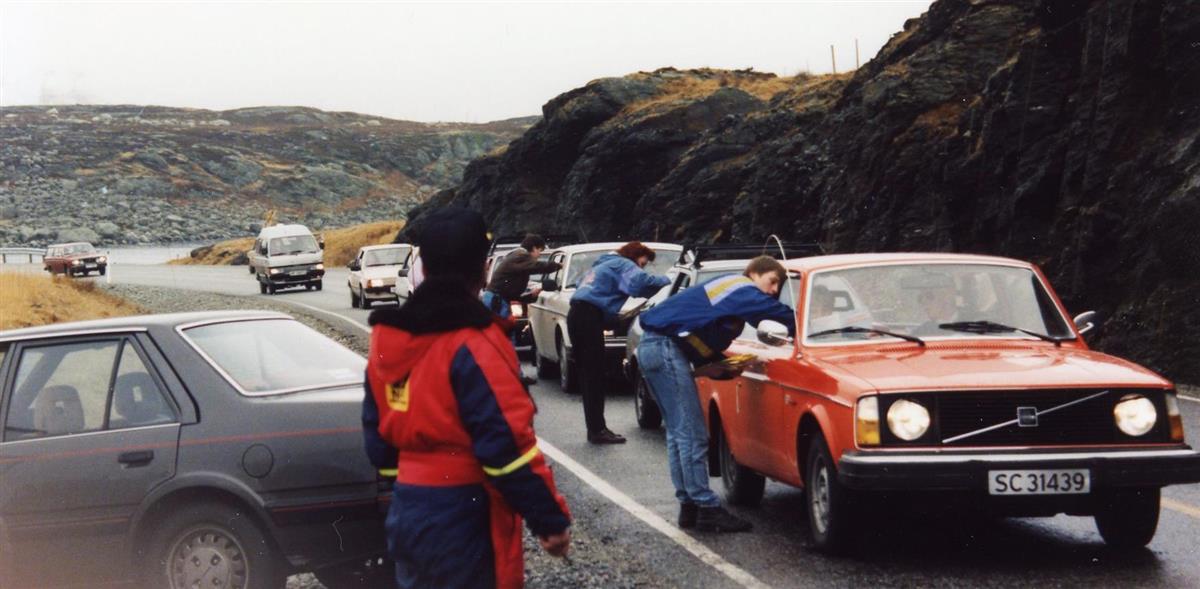 Bildet er frå opningsdagen av Boknasundbrua, 22.02.91, då skuleelevar ønska bilistar velkomne til Bokn. Same dag opna vegstrekket frå Boknasundbrua til Arsvågen.