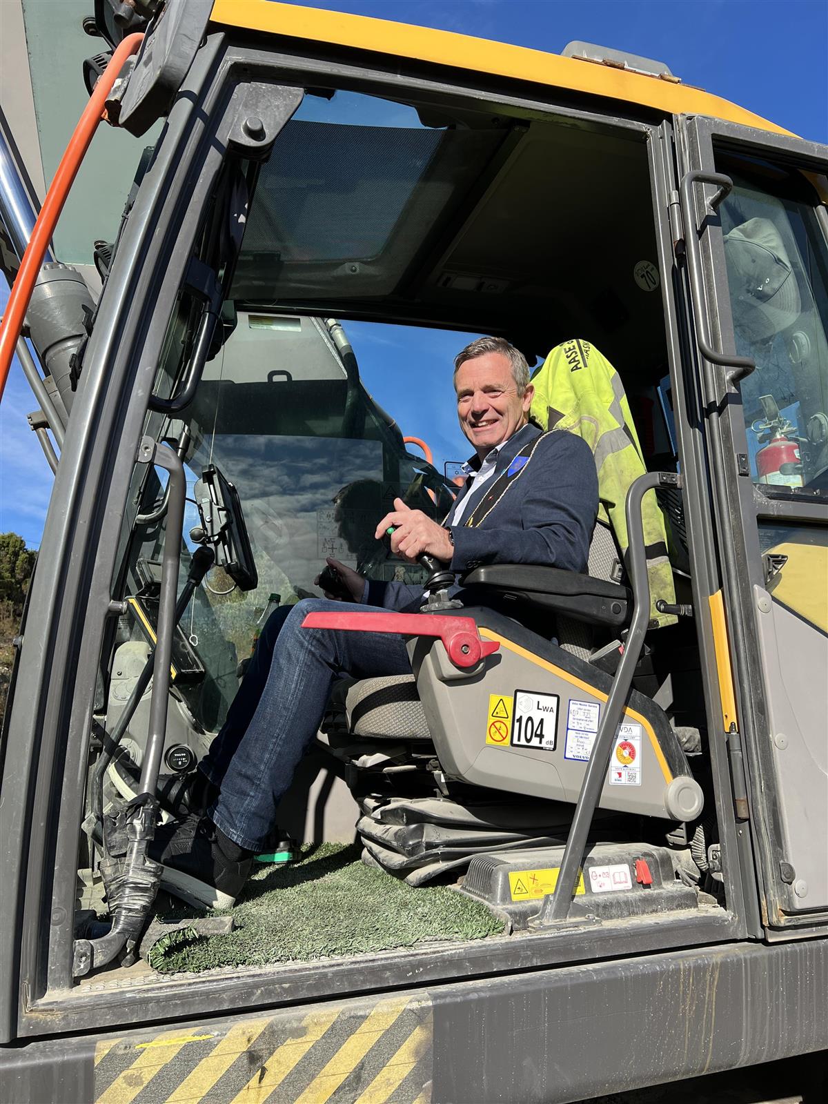 -Ja, dette er ein stor dag, gliste ordførar Egil Våge, etter å ha utført prosjekstarten på ein av gravemaskinane til maskinentreprenør Aase & Svendsen. Dei står for grunnarbeidet og starta for fullt i i dag, 1. oktober.