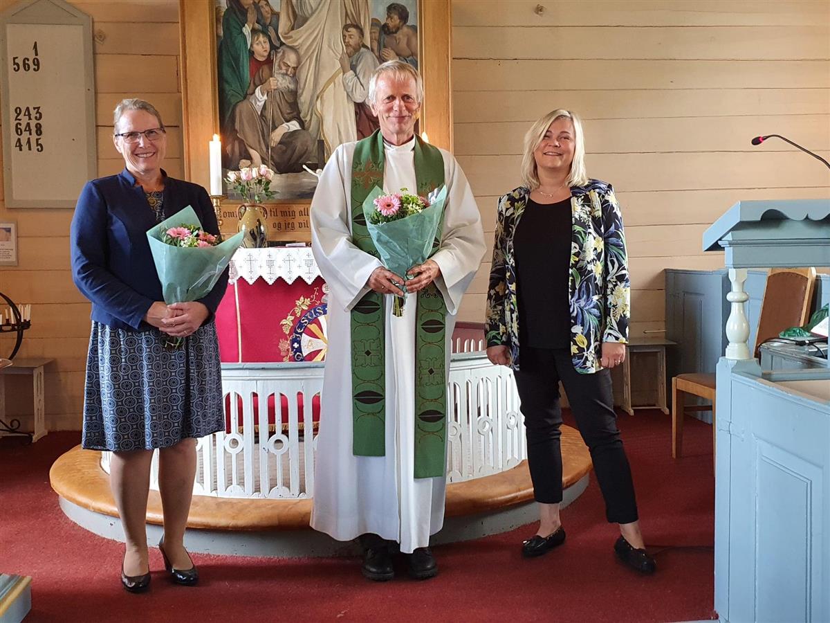 Fv. kateket Marit Sofie Teistedal, sokneprest Tor Egil Eriksen og soknerådsleiar Merete Alvestad.