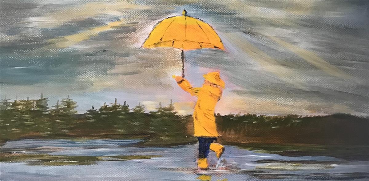 Den gule, som blei kalla jenta med paraplyen i samband med debututstillinga, er med i mange av maleria hennar. Ho trur den gule treffer mange.