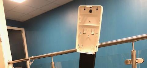 Øydelagd spritdispenser ved døra til det populære møterommet Boknahåve i 2. etg.
