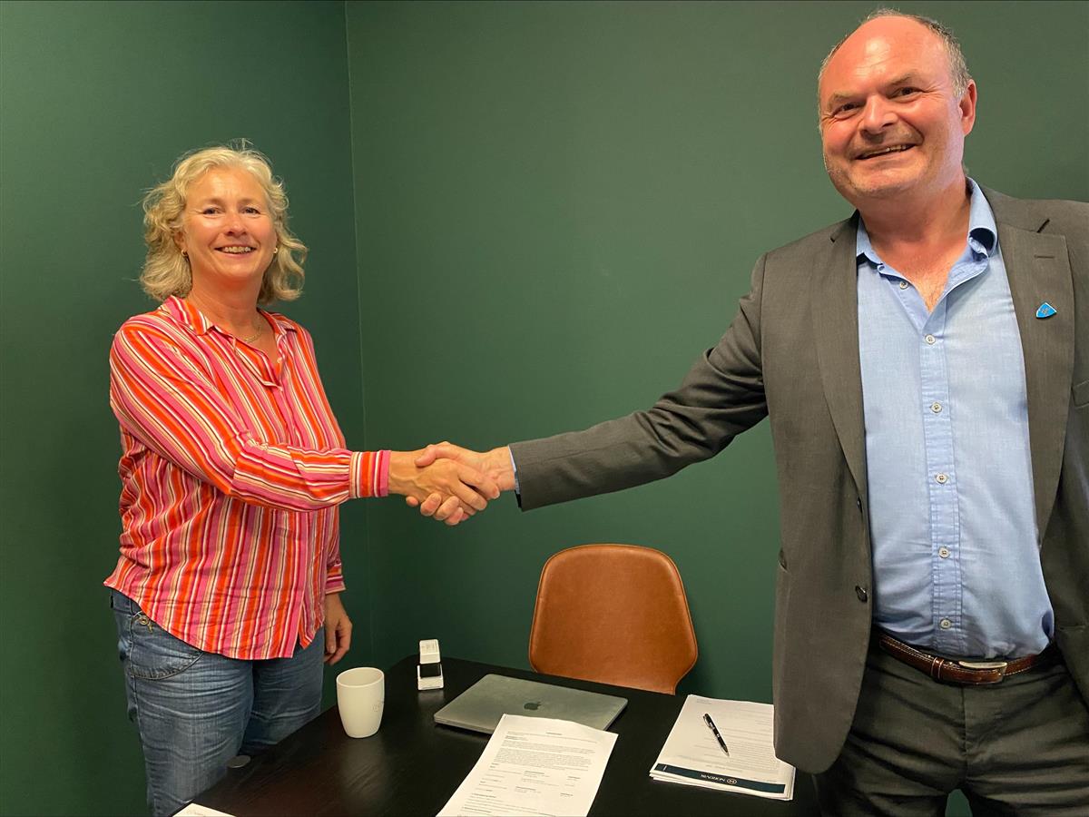 30. 06.23: Sonja Mikkelsen og ordførar Osmund Våga har signert kjøpekontrakten.