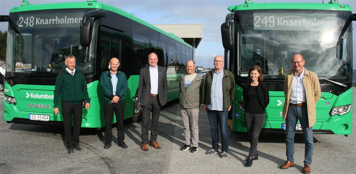 Fv. Bussjåførane Trond Nedrebø og Tom Inge Håland, ordførar Osmund Våga, driftsleiar transport Nord Rogaland Per Ivar Aase, rådgivar transport Jostein Fisketjøn, kommunedirektør Ingeborg Skjølingstad og driftssjef transport, Geir Helge Hagen.