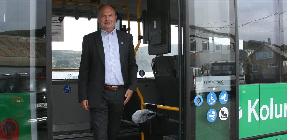 Første tur: Ordførar Osmund Våga gjekk av bussen i Føresvik kl. 09:40.