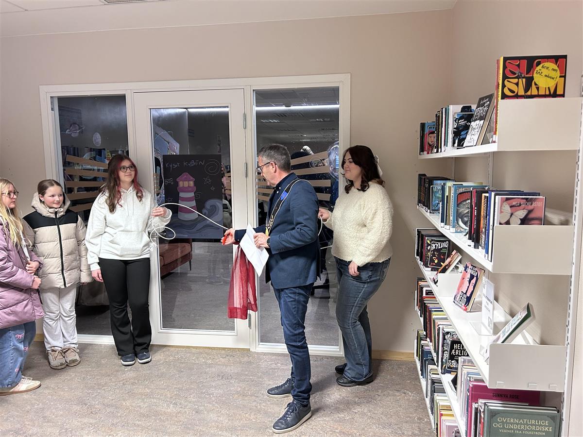 Ordførar Egil Våge kuttar snora til Kystkuben. Dekoratørane av rommet, Linnea Elisabeth Palmer (til høgre) og Oleksandra Lisovska (Sasha) held snora. Heilt til venstre: Michelle Kallevik Våge og Thea Kristoffersen gler seg til døra går opp.