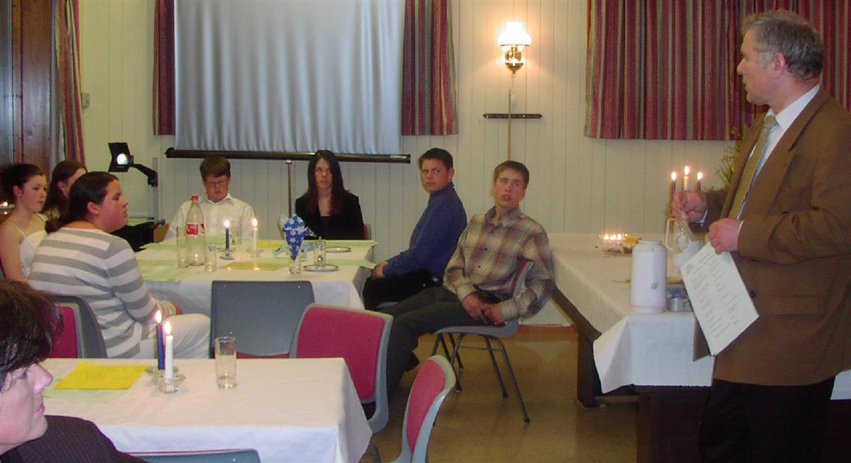 Presten er ein god talar. Her held han tale for konfirmantane på Bedehuset i 2004.