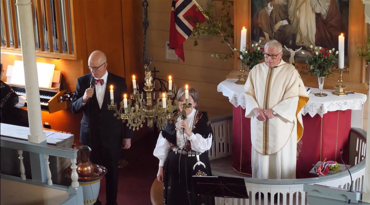 Frå den digitale gudstenesta, 17. mai 2020. Fv. organist Bergfrid Seibt, songsolistane Håkon Sletten og May Jorunn Vatnaland og Arne Aurdal.