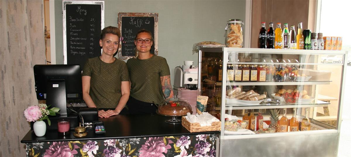 Anna Maria Stef og Hilde-Gunn Alvestad var dei første kundane på den nye kaféen. Den første halvtimen var det konstant kø framfor disken, god stemning med besøk av TVH og sjampanjemarkering.