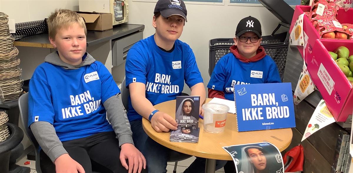Fv. Jarl Kro Medhaug, Johannes G. Alvestad og Noah Hesthammer sel lodd til skulebasaren 2021.