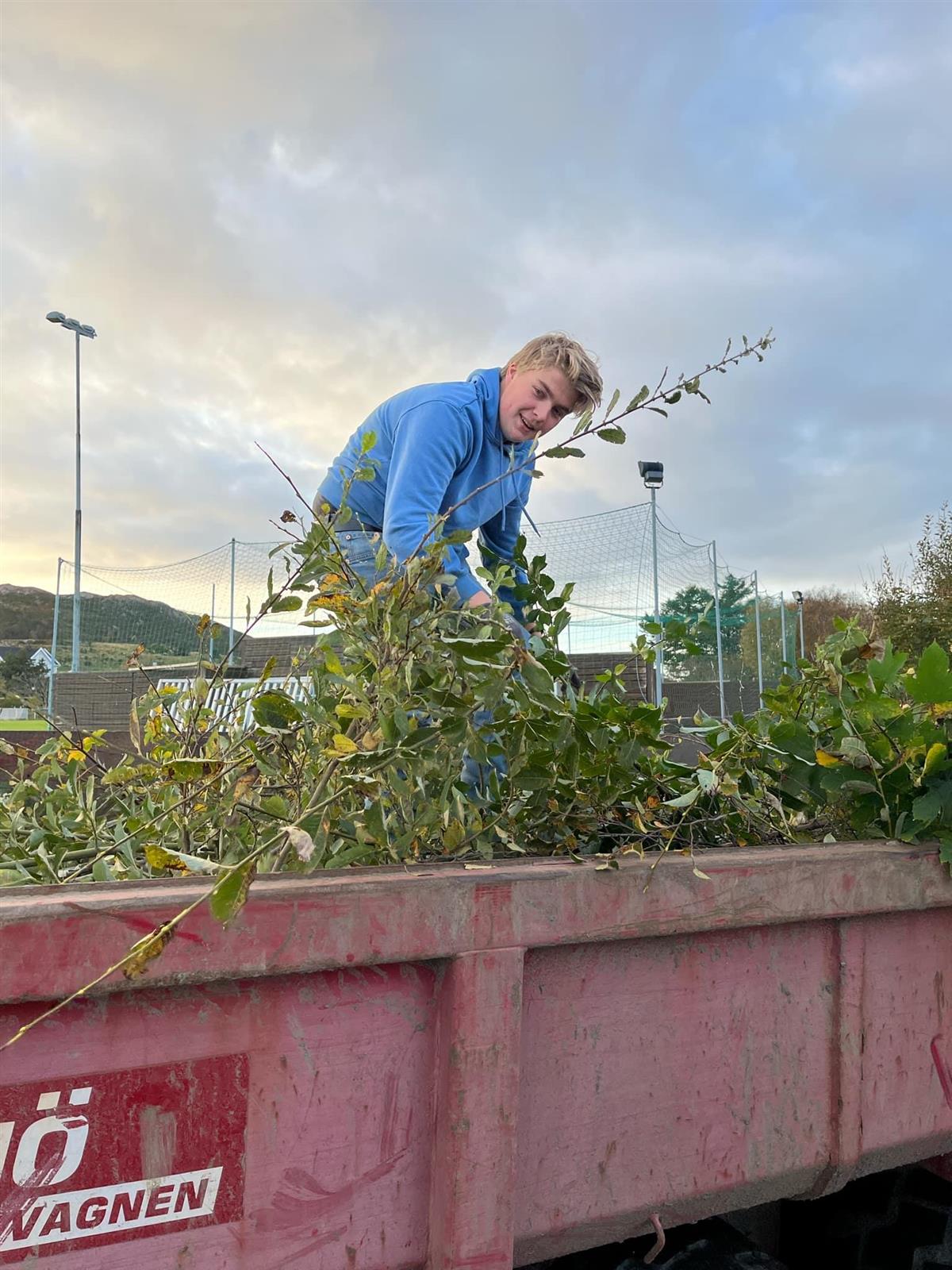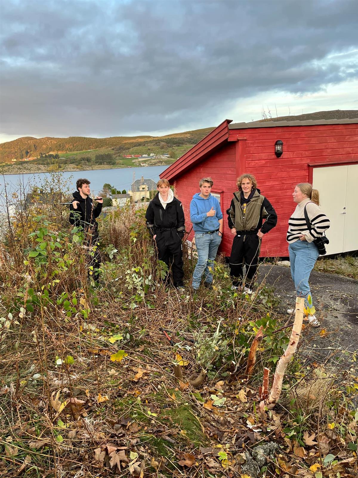 Måndag 14. oktober, dugnad på gang på Bokn idrettshus, veret kom som bestilt, med lite, eller mest ikkje vind, sol og nokre plussgrader. Ungdomsrådet kom til avtalt tid, og med redskap til å sage og kutte ned buskar og kvist rundt idrettshuset.