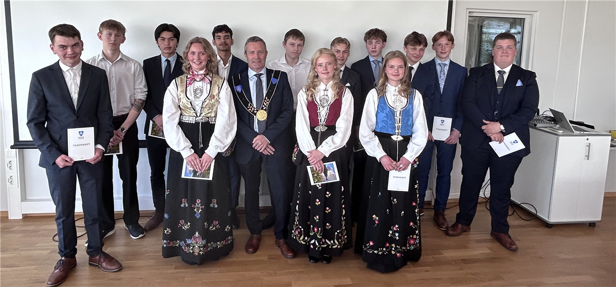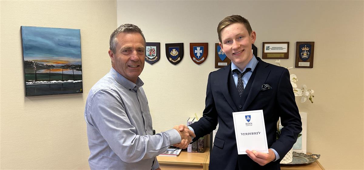 Jonas Lindnes Thuestad mottar verdibrev av ordførar Egil Våge, 25. juni.