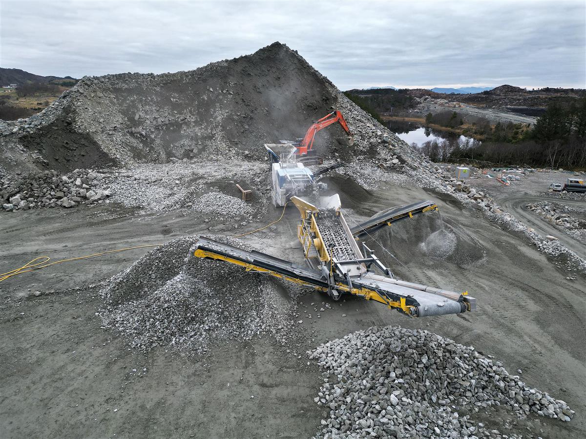 Knusing av steinmassar til vegbygging ved Laupland pågår.