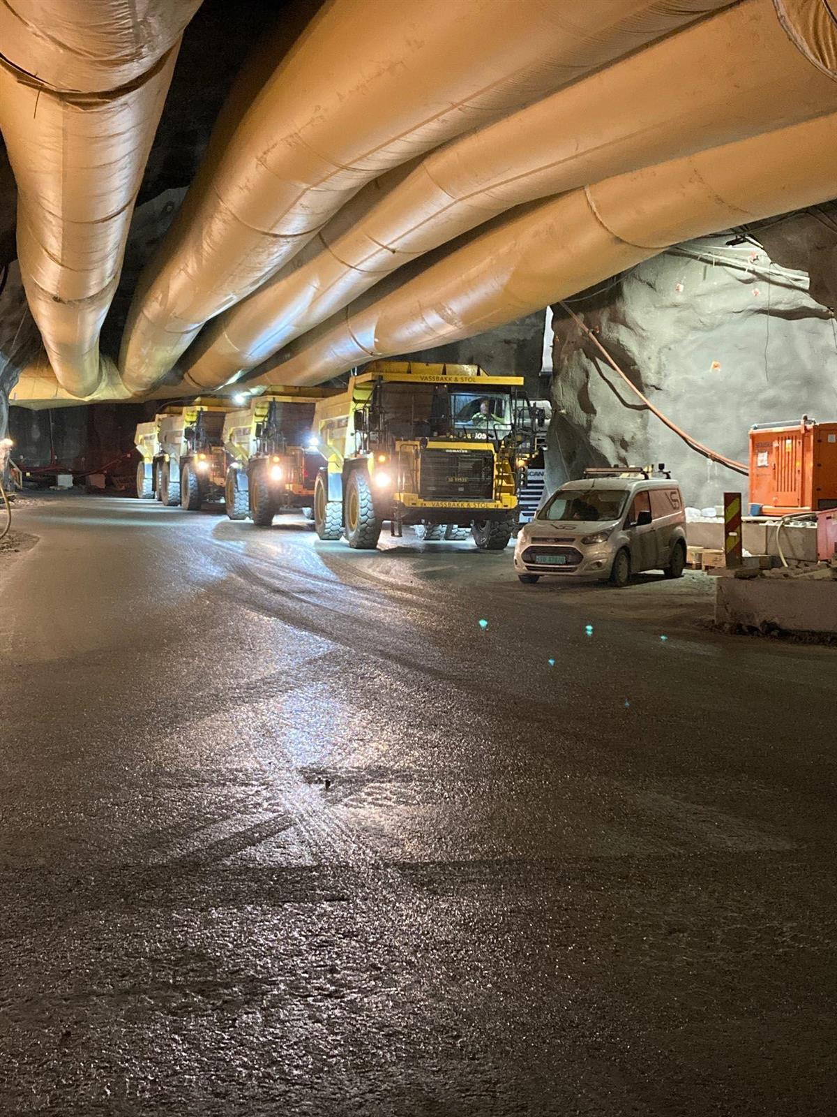 Tipptruckar klare til salvekøyring i krysset i tunnelen ved Arsvågen.