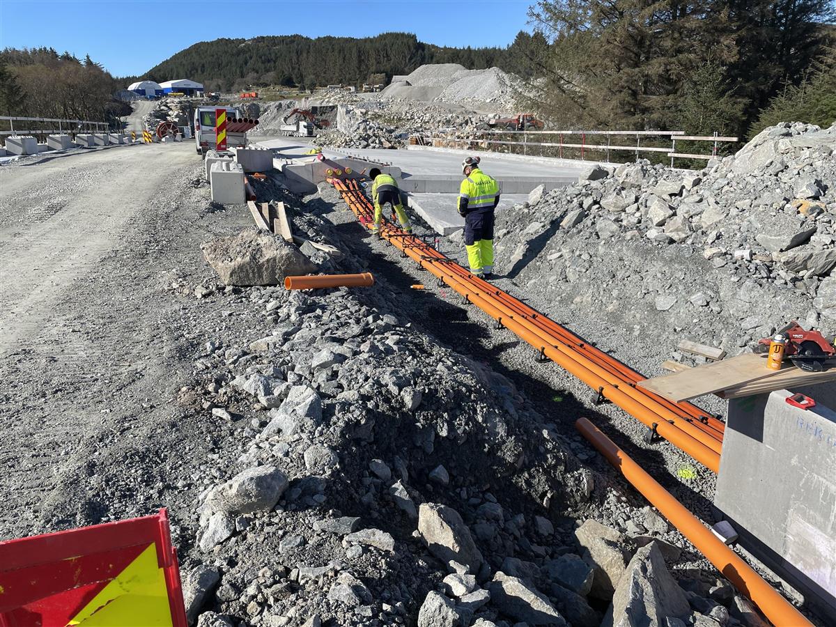 Ute i dagsona, frå tunnelpåhogget til kryss med eksisterande E39 held arbeidet med grøfter, kummar, røyr og sikring av fjellskjeringane fram til vegoppbygginga startar i sommar.