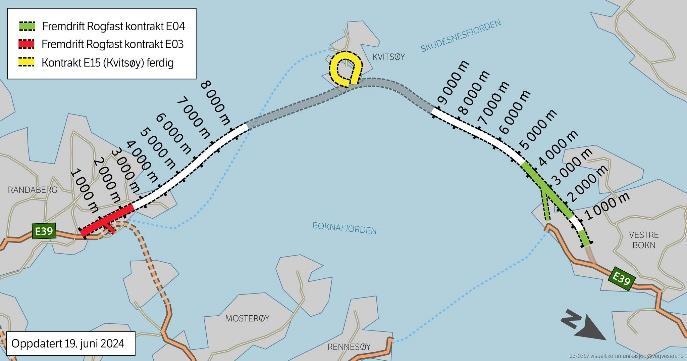 Framdriftskart E39 Rogfast pr. juni 2024. Grøn farge viser sprengning frå Bokn.