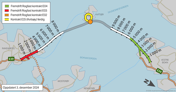 Kart som viser utført sprenging. I hovudtunnelen er det raud farge frå sør, og grøn frå nord. På Kvitsøy pågår det sprenging inn mot krysset med hovudtunnelen.Då er vi komne fram til siste informasjonsbrev i 2024. Vi kan konstatera at det har vore eit godt arbeidsår med stor aktivitet. Ca 1/3 av kontraktarbeidet som Skanska utfører er no utført.